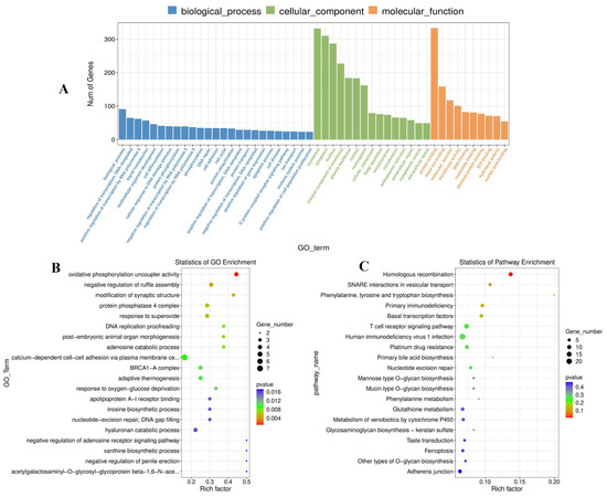 Moreover, GO analysis found 4611 GO terms based on the cis-regulated target genes (Table S9), including 77 significant terms (p < 0.05). The target genes of the identified DE lncRNA in this study were shown to be associated with negative regulation of ruffle assembly, modification of synaptic structure, response to superoxide, and DNA replication proofreading. The molecular functions were mainly focused on oxidative phosphorylation uncoupler activity and acetylgalactosaminyl-O-glycosyl-glycoprotein beta-1,6-N-acetylglucosaminyltransferase activity. In addition, the main cellular components were related to the protein phosphatase 4 complex and the mitochondrial oxoglutarate dehydrogenase complex (Figure 6A,B). KEGG pathway analysis indicated that the target genes of the discovered DE lncRNAs were primarily enriched for homologous recombination, SNARE interactions in vesicular transport, and phenylalanine, tyrosine, and tryptophan biosynthesis (Figure 6C, Table S10).
