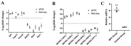 The verification result by RT-qPCR. (A) The validation of RT-qPCR with six mRNAs (n = 3). (B) The validation of RT-qPCR with six lncRNAs (n = 3). (C) Comparison of the relative mRNA expression levels of Bach2 in the spleens of sequenced mice between the MPV group and the control group (n = 3). Significant differences are indicated by ** (p < 0.01).