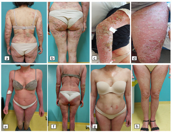 - Miladi, R.; Janbakhsh, A.; Babazadeh, A.; Aryanian, Z.; Ebrahimpour, S.; Barary, M.; Sio, T.T.; Wollina, U.; Goldust, M.; Mohseni Afshar, Z. Pustular Psoriasis Flare-up in a Patient with COVID-19. J. Cosmet. Dermatol. 2021, 20, 3364–3368. [Google Scholar] [CrossRef]