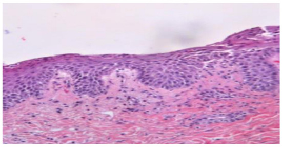 A 56-year-old woman (BMI = 29 kg/m2) came to the Emergency Department of the University General Hospital of Larissa, Central Greece with acute generalized pustular flare up that occurred 5 days after the second dose of BNT162b2(Pfizer) vaccination. The prior four months, she was under treatment with methotrexate (10–15 mg/week) for plaque psoriasis control plus conventional filicine supplements. Three days after the first dose of the vaccination, the patient reported the appearance of small pustules on the abdomen and thighs. She was initially treated with topical corticosteroid preparations but with moderate response. The fifth day after the second dose of her vaccination, the patient presented with painful erythematous skin patches with pinhead-sized sterile pustules, mainly located on the back, upper arms, abdomen area, thighs, soles and palms (Figure 1), as well as systemic symptoms such as malaise, fever and muscle pain combined with extremely high CRP blood levels. Exfoliation and erythema were observed during the clinical examination and a skin biopsy was performed. Histopathology revealed Munro microabscesses, particularly in the upper layers of the epidermis, acanthosis and hyperkeratosis, as well as regions with intraepidermal acantholysis, skin swelling with capillary dilation and diffuse presence of lymphocytes. The above findings suggest that the diagnosis is generalized pustular psoriasis (Figure 2). A gene test for IL36RN and CARD14 genes, whose variants are gene-contributors to pustular dermatosis [13], was proposed, but due to patient’s personal refutation was not performed. At first, the patient was treated with antibiotic treatment and acitretin at a dose of 35 mg once daily for 7 days with no response. Due to the common pathway of IL-1 that shares the pathophysiology of pustular psoriasis as well as the inflammatory process and/or the unstable cytokine production triggered by COVID-19 vaccination [11,12], anakinra was initiated with a daily subcutaneous injection of 100 mg. Administration of acitretin at a dose of 25mg/day was continued. Pustules and the accompanied erythematous plaques resolved the tenth day after anakinra initiation (Figure 1). One week later after stopping anakinra, she presented a pustular psoriasis flare and anakinra was re-administered at a dose of 100 mg subcutaneous for 7 days in combination with a lower dose of acitretin (10 mg/day). After 7 days, the skin lesions improved remarkably. A dose reduction and a day-to-day administration of anakinra was followed while, at the same time, treatment with guselkumab, a human IgG1λ monoclonal antibody (mAb) against IL-23, was started with a dose of 100 mg, for control of the plaque psoriasis disease. An IL-17 inhibitor was not preferred due to previous failure of the specific drug category to treat the psoriasis disease in this patient. The medication scheme preserved clinical remission. The patient, despite the recent vaccination, had COVID-19 infection after three months with mild clinical course that did not also affect the course of the patient skin disease.