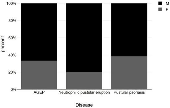 Presentation of sex distribution (using chi-square test) among AGEP, neutrophilic pustular eruption and pustular psoriasis cases occurred after COVID-19 vaccination (M: Male, F: Female) (p = 0.69).