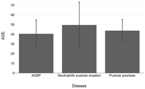 Presentation of age bars with 95% confidence interval (using t-test) amongst AGEP, neutrophilic pustular eruption and pustular psoriasis cases occurred after COVID-19 vaccination (p = 0.78).