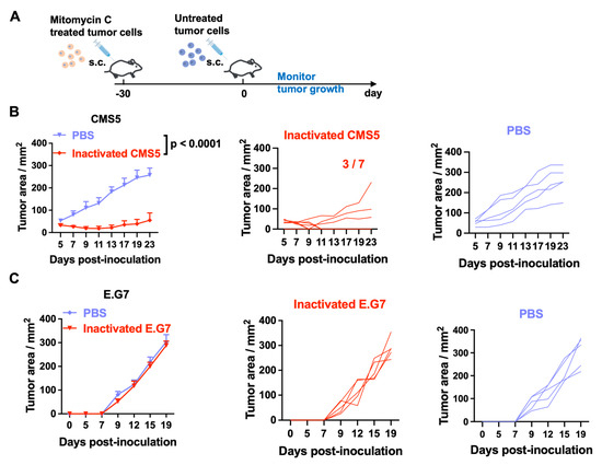 Tumor protection achieved by vaccination with inactivated tumor cells. (A) Schematic illustration of mitomycin C (MMC)-treated tumor cells and tumor challenge. Tumor cells were incubated with MMC for 30 min as the inactivated tumor vaccine, which were injected s.c. into the right flank of mice. Mice were challenged with live tumor cells after 30 days (inactivated CMS5/ E.G7 group). Mice injected with PBS at −30 days and then challenged with live tumor cells were set as the control group (PBS). Tumor development was monitored. (B) Tumor development in the CMS5 tumor model. (C) Tumor development in the E.G7 tumor model.