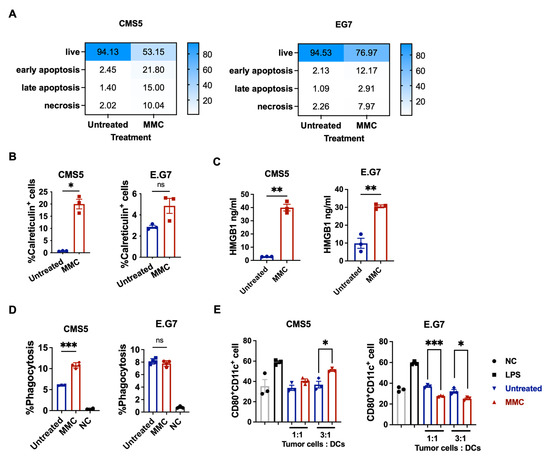 To explore the discrepancies between the two tumor cells, the cell changes induced through MMC treatment were investigated, including cell apoptosis, calreticulin translocation, and high-mobility group box 1 (HMGB1) secretion, to determine why inactivated CMS5 and E.G7 cells conferred distinct tumor protection effects. Following CMS5 or E.G7 treatment with 60 μM of MMC at 37 °C for 30 min, the cells’ apoptosis, calreticulin translocation, and HMGB1 secretion were detected after 48 h. CMS5 had a higher apoptosis and calreticulin positive ratio than E.G7, according to flow cytometry data (Figure 2A,B). CMS5 cells treated with 60 μM of MMC secreted a higher level of HMGB1 compared with E.G7 cells after collecting their culture medium and analyzing it with a HMGB1 ELISA kit (Figure 2C). Based on these results, it was demonstrated that CMS5 treated with MMC induced more immunogenic cell death. As these damage-associated molecular patterns (DAMPs) could promote the uptake of dying tumor cells via a phagocytosis mechanism and the subsequent activation of dendritic cells (DCs), we employed a flow cytometry analysis to assess DC phagocytosis of tumor cells and tumor cell stimulation of DC maturation. The percentages of CMS5 cells phagocytized by BMDCs were significantly increased with MMC treatment. But no such difference was observed with E.G7 cells (Figure 2D). Furthermore, MMC treated CMS5 cells induced elevated DCs expression of CD80, but MMC-treated E.G7 stimulated less CD80 expression on DCs in comparison with untreated E.G7 (Figure 2E). These results indicate that CMS5 treatment with MMC induces the immunogenic cell death and activation of dendritic cells (DCs), which may process and present tumor antigens to T cells, resulting in a robust anticancer immune response. In addition, these results may explain why the E.G7 model failed to produce a significant antitumor response.