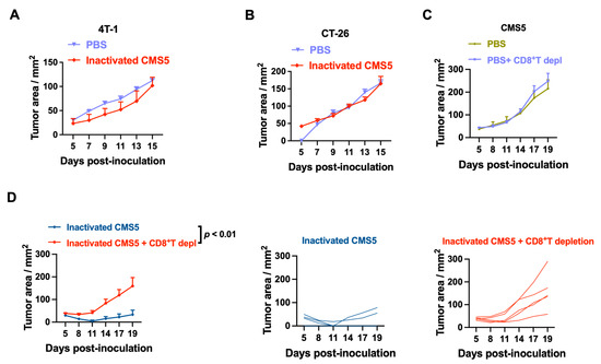 To investigate if the tumor protection was tumor-cell-specific, mice vaccinated with inactivated CMS5 cells were challenged with either 4T-1 or CT-26 tumor cells. As shown in Figure 3A,B, there was neither protection against the two heterologous tumor cell challenges nor a significant difference compared to the PBS group. This result suggests that an inactivated CMS5 vaccine cannot protect against heterozygous tumors using this protocol.