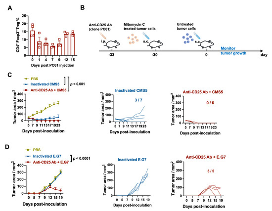 Combining inactivated tumor cells with anti-CD25 antibodies enhanced the antitumor effect to tumor challenge. (A) Schematic illustration of inactivated tumor cells combined with anti-CD25-antibody-promoted tumor protection. Mice were injected i.p. with 200 μg of anti-CD25 antibodies (clone PC61) at −33 days. Then, MMC-treated inactivated tumor cells were vaccinated at −30 days. The mice were then challenged with untreated tumor cells. Tumor growth was monitored. (B) The effect of anti-CD25-antibody-mediated Treg depletion. The level of CD4+Foxp3+ Treg cells in PBMCs were analyzed through flow cytometry. (C) Inactivated tumor cells combined with anti-CD25 antibody vaccination induced tumor protection in the CMS5 tumor model. (D) Inactivated tumor cells combined with anti-CD25 antibody vaccination induced tumor protection in the E.G7 tumor model.