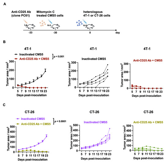 Anti-CD25 antibodies combined with inactivated CMS5 cell vaccination induced antitumor responses against heterologous tumor challenges. (A) Schematic illustration of heterologous tumor challenge to mice vaccinated with anti-CD25 antibodies plus inactivated CMS5 tumors. (B) Tumor development in mice vaccinated with inactivated CMS5 cells or anti-CD25 antibodies plus inactivated CMS5 cells and then challenged with 4T-1 tumors. (C) Tumor development in mice vaccinated with inactivated CMS5 cells or anti-CD25 antibodies plus inactivated CMS5 cells and then challenged with CT-26 tumors.