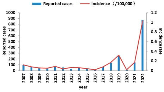 Reported cases and incidence from 2007–2022 in Jiangsu Province, China.