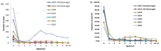 Cases of pertussis in people aged 0–14 years in Jiangsu, 2007–2022. (A) Number of cases by age and year. (B) The proportion of cases among individuals aged 0–14 years by age and year.