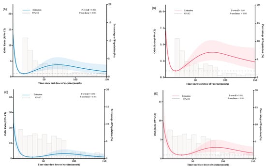 The duration after immunization was determined according to the minimum OR (OR = 1) of the RCS model fitting; the OR can reflect the relationship between the duration after immunization and the IgG antibody concentrations (≥20 IU/mL). A graph was then plotted with the post-immunization duration on the x-axis and the OR value for the model-predicted PT-IgG antibody concentration ≥20 IU/mL on the y-axis. The color intervals represent the 95% confidence interval for the OR. (A) The duration after immunization and the OR of having PT-IgG antibody concentrations ≥20 IU/mL in children with a documented immunization history (1–4 doses). (B) The duration after immunization and the OR of having FHA-IgG antibody concentrations ≥20 IU/mL in children with a documented immunization history (1–4 doses). (C) The duration after immunization and the OR of having PT-IgG antibody concentrations ≥20 IU/mL in children who received a full course of pertussis vaccination (four doses). (D) The duration after immunization and the OR of having FHA-IgG antibody concentrations ≥20 IU/mL in children who received a full course of pertussis vaccination (four doses).
