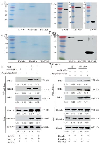 The expression, purification, and self-assembly verifying VP4, VP56, and VP35 proteins. (A) SDS-PAGE analysis of the VP4, VP56, and VP35 proteins after expression and purification by E. coli. (B) Western blot analysis of VP4, VP56, and VP35 proteins. The His-VP4 (67 kDa), GST-VP56 (81 kDa), and His-VP35 (36 kDa) proteins detected using GST mAbs or His mAbs as the primary antibody and horseradish-peroxidase-labeled goat anti-mouse IgG HRP as the secondary antibody. (C) SDS-PAGE analysis of the VP4, VP56, and VP35 proteins after expression and purification by P. pastoris. (D) Western blot analyses of VP4, VP56, and VP35 proteins. The His-VP4 (69 kDa), His-VP56 (59 kDa), and His-VP35 (36 kDa) proteins were detected using His mAbs as the primary antibody and horseradish peroxidase-labeled goat anti-mouse IgG HRP as the secondary antibody. (E,F) The VP4, VP56, and VP35 binding verified by pull-down analysis. E. coli protein samples and P. pastoris protein samples in 20 mM phosphate or 40% saturated (NH4)2SO4 buffer were used for incubation at 4 °C for 36 h.