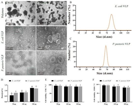 Detection of the appearance characteristics and cytotoxicity of E. coli VLPs and P. pastoris VLPs. (A) TEM image of polymers, E. coli VLPs, and P. pastoris VLPs. (B) E. coli VLP analysis using DLS. (C) P. pastoris VLP analysis using DLS. (D) Hemolysis study of E. coli VLPs and P. pastoris VLPs. Hemolytic activity of each group was detected with 2% grass carp red blood cells for 1 h at 37 °C. Data are expressed as mean ± SD (n = 3). (E) Toxicity assessment of E. coli VLPs and P. pastoris VLPs on CIK and (F) FHM cells by MTT assay. Data are expressed as mean ± SD (n = 3). Different lowercase letters in each group denote significant variations as calculated by the Kruskal–Wallis test followed by Dunn’s multiple comparisons test (p < 0.05).