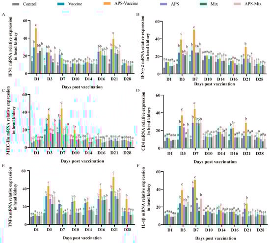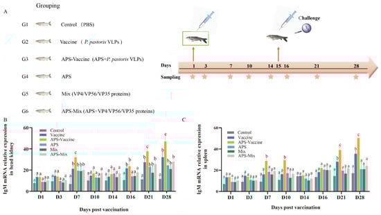 The experimental flow and sampling time points are presented in the schedule (Figure 3A). The experimental results were compared among the following groups: Vaccine group, APS–Vaccine group, APS group, Mix group, APS–Mix group, and Control group (Figure 3A). The expression levels of IgM mRNA in the head kidney and spleen were measured by qRT–PCR after vaccination and viral challenge (Figure 3B,C). The results showed that the APS–Vaccine group exhibited the highest expression levels of IgM mRNA compared with the other groups, with a significant difference. Additionally, the APS–Vaccine group showed elevated levels of IgM mRNA at D28.