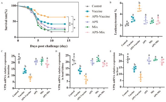 Following the vaccination and challenge tests, the survival rates were as follows: 42% (Vaccine group), 62% (APS–Vaccine group), 28% (APS group), 24% (Mix group), 30% (APS–Mix group) and 22% (Control group). The APS–Vaccine group displayed a significantly higher survival rate than the control group (Figure 4A). Leukocyte number analysis revealed that the proportion of leukocytes in hematocrit was 5.1% in the APS–Vaccine group, which was significantly higher than in the control group, (2.24%) (Figure 4B). Furthermore, the APS–Vaccine group exhibited a significant reduction in GCRV viral content compared with the control group in various tissues (intestine, head kidney, and liver) (Figure 4C–E). Based on the antibody levels, survival rates, and tissue viral load test, it can be concluded that the APS–Vaccine group effectively increased IgM levels, improved survival rates, alleviated tissue virus load, and prevented viral infection.