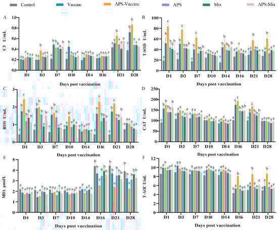 During the experiment, the six groups were evaluated to assess their ability to combat GCRV-II infection in grass carp, with eight-timepoints selected for sampling. The levels of C3, T-SOD, MDA, CAT, T-AOC, and ROS were measured as indicators. The content of C3 in the APS–Vaccine group showed a significant increase at D3, D7, D21, and D28, and was notably higher than the Control group at the same time points (Figure 5A). Meanwhile, after vaccination and viral injection, the T-SOD content gradually decreased due to the neutralization of virus clearance, and there was a significant difference between the APS–Vaccine group and the Control group at all sampling time points (Figure 5B). The ROS activity in the APS–Vaccine group was significantly higher than in the Control group on D1, D3, D7, D10, D16 and D21 (Figure 5C). The activity of CAT significantly increased on D1 D16, and D21 in the APS–Vaccine group (Figure 5D). The MDA activity in the APS–Vaccine group exhibited significant differences compared with the Control group on D16, D21, and D28 (Figure 5E). Likewise, T-AOC activity initially decreased after the viral challenge and then increased. In the APS–Vaccine group, the T-AOC activity significantly differed from that of the Control group on D16, D21, and D28 (Figure 5F). These findings suggest that the fish in the APS–Vaccine group had successfully activated various immune and antioxidant enzymes in their sera, which may have contributed to their ability to resist GCRV infection.