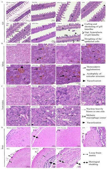Histopathological examination of gill, spleen, trunk kidney, and brain tissues from grass carp post-vaccination and challenge. On D18, the gills, spleens, trunk kidneys, and brains were removed from grass carp to make sections and then stained with HE. Healthy grass carp tissues were used as the blank control. (A) Tissue scanning photographs of the gill. Gap hyperplasia of the gill lamella, curling, and shortening of gill lamellae, and sloughing of the epithelial cells were the three main lesion signs in gills. (B) Tissue scanning photographs of the spleen. Hemosiderin agglutination, acidophily of reticular structure, and vacuolization were the three main lesion signs in spleens. (C) Tissue scanning photographs of the trunk kidney. The nucleus heavily biases to one side of the cell, melanoma–macrophage centers, and vacuolization were the three main lesion signs in trunk kidneys. (D) Tissue scanning photographs of the brain. Loose brain matrix and meningeal shedding were the two main lesion signs in the brains.