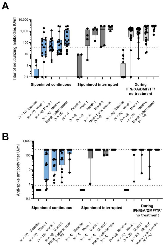(A) SARS-CoV-2-specific neutralizing antibody levels in U/mL. (B) SARS-CoV-2-specific serum total antibody levels in U/mL. All the patients with available data were included in the analysis, and individual values are represented by dots. For 11 booster patients, the month 6 visit and the month 1 after the booster visit were identical (cohort 1: n = 7; cohort 2: n = 1; cohort 3: n = 3). The bars show the median values; the black dotted lines indicate assay-specific cut-offs for seropositivity; and the gray dotted lines indicate the maximal value of the quantification range. DMF: dimethyl fumarate; GA: glatiramer acetate; IFN: interferon-beta; n: number of patients with assessments; TF: teriflunomide; and U: units.