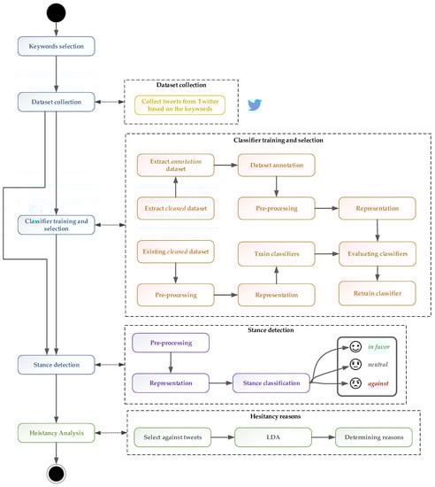 In order to extract and analyze the hesitant tweets related to COVID-19 vaccination, a series of steps are needed, as presented in Figure 1 and discussed in the following.
