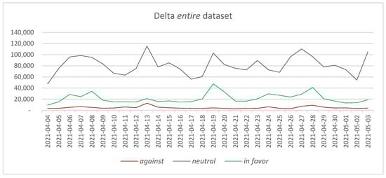 In the case of the Delta entire dataset (counting for 3,218,843 tweets), it can be observed that most of the tweets are in the neutral category (Figure 2), representing 75.44% of the total number of extracted tweets, followed by the in favor tweets, accounting for 20.09% of the tweets in the dataset, and the against category, accounting for 4.46% of the tweets.