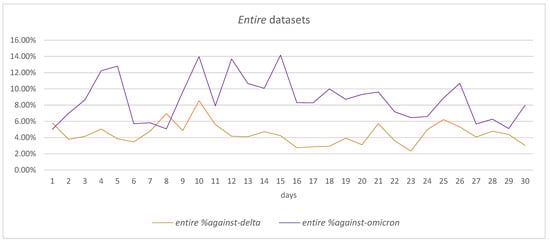 Comparing the entire datasets in the two periods in terms of against tweets, it can be observed that, overall, the percentage of against tweets on a daily basis has been higher in the case of the Omicron entire dataset than in the case of the Delta entire dataset, with an average of 4.47% for Delta versus 8.71% for Omicron—Figure 6.
