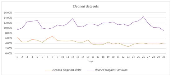 As for the cleaned datasets (Figure 7), the changes in the percentage of against tweets are smoother across the 30-day period, even though some peaks can be observed as well. The average percentage of against tweets is smaller in the case of the Delta cleaned dataset (4.41%) than in the case of the Omicron cleaned dataset (11.33%).