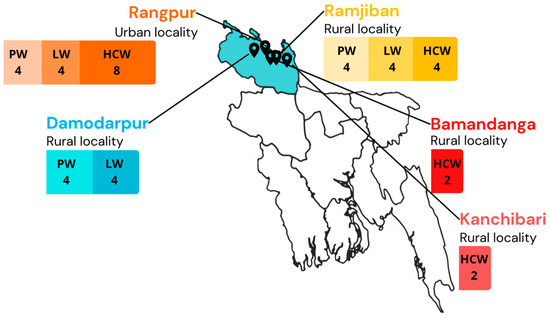 In this cross-sectional qualitative study, 12 pregnant women, 12 lactating women, and 16 health workers were interviewed for a total of 40 interviews between April and August 2022. Participants were recruited from five different communities in Rangpur Division in northern Bangladesh: Bamandanga (rural), Damodarpur (rural), Kanchibari (rural), Ramjiban (rural), and Rangpur city (urban).
