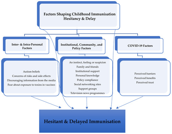 The parents demonstrated a strong sense of mistrust in institutions and healthcare as a result of the COVID-19 pandemic. Mistrust towards immunisation was expressed as suspicion, and some parents felt that COVID-19 affirmed their decision due to the number of cases where people took three shots and suffered from side effects. They also expressed that vaccine producers did not care about anything except money. The previous literature on the COVID-19 vaccine, as well as vaccines in general, has shown how trust of various kinds impacts vaccine hesitancy [21,25]. The results of this study further emphasise the important role of trust in childhood immunisation Figure 1 presents the thematic model of the social–ecological factors shaping childhood immunisation hesitancy and delay in this study.