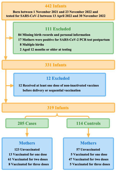 We conducted this test-negative case-control study in Guangzhou, Guangdong Province, China, where newborns exceeded 360,000 in 2022. China initially began rolling out COVID-19 vaccination in late 2020. Hence, during the Guangzhou outbreaks in 2022, these infants born to vaccinated mothers would be approximately within 12 months (one year old) when they were tested for SARS-CoV-2. Therefore, we included 442 infants, born between 1 November 2021 and 23 November 2022, and their mothers. These infants were under unified management due to the Guangzhou outbreaks between 13 April 2022 and 30 November 2022. During this study period, Guangzhou had relatively strict control measures against COVID-19, which required all cases and close contacts to undergo quantitative real-time polymerase chain reaction (qPCR) test for SARS-CoV-2.