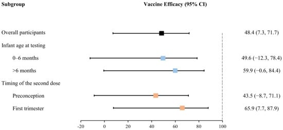 Contrary to the conclusions of most studies that vaccine effectiveness declined over time after infants’ birth [,,], this study found that the effectiveness of maternal full vaccination was higher in infants over 6 months after birth than that in younger infants, which seemed out of the ordinary. However, this conclusion had a relatively large confidence interval and was not statistically significant and might be related to the insufficient sample size of infants in our study.