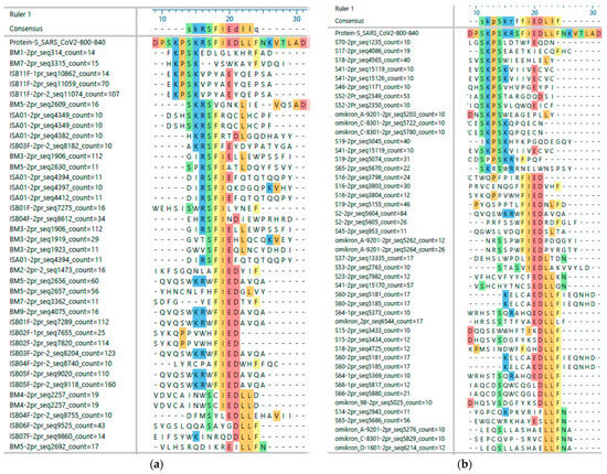 Alignments from sequences enriched for the second furin cleavage site epitopes in the S-protein of SARS-CoV2 showing different antibody recognition patterns between vaccination (a) and COVID-19 (b). For this example, all sequences with 4-mers identical to the sequence KPSKRSFIEDLLFNK were retrieved from 78 data sets of COVID-19 and 29 data sets of vaccinated patients, resulting in 6790/11,083 different sequences found 13,256/22,826 times in 46 Mio. and 18 Mio. sequences in total. The alignment shows only sequences found at least ten times with a 5-amino-acid identity to the antigen. Amino acids identical with the antigen are highlighted by colors indicating their chemistry, the antigen reference sequence is fully colored. The data set and sequence IDs are internal patient numbers: first (1pr) or second (2pr) selection rounds, and sequence number and frequency ‘count’ found in the NGS data set. The first and second selection data sets often contained different data sets with occasionally identical sequences.