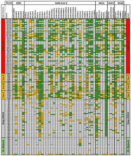 However, it also generates unexpected results, such as cross-reactive epitopes and at least two sequences specific for diseased and vaccinated patients, but apparently linked primarily to the immune reaction to the S-protein (N-N-71Na1) or general coronavirus infections (H-M-5Na1). Restricting the screening to a limited set of peptide epitopes in microarrays allowed for the efficient screening of a large number of sera, despite the limited sample volumes available in many cases.