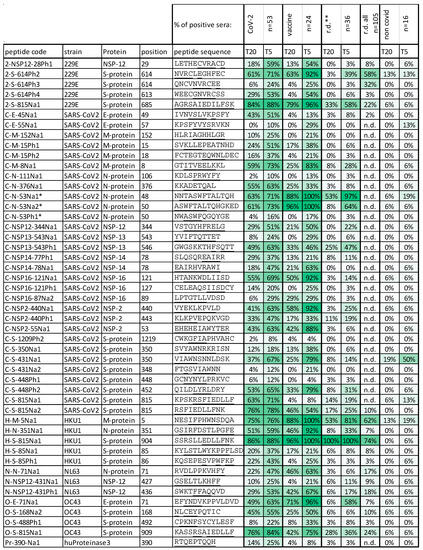 The large number of epitopes recognized in non-structural proteins allows for the generation of more general diagnostic tools for coronaviruses. These antibodies have not been studied routinely thus far, and only recently has T-cell cross-reactivity been described [34]. They do not contribute directly to the protection against the virus by antibodies, but, as can be observed from the general frequency in all sera, their levels will allow differentiation against recent infections, even in vaccinated individuals.