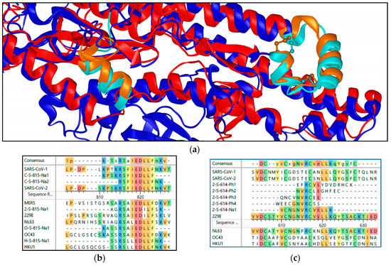 Structural identity even with different sequences: (a) Alignment of SARS-CoV-2 (red, pdb:6vxx) and 229E (blue, pdb:6u7h) structures of the second domain of the S-protein. In light colors, furin cleavage site 2 in the left center (epitopes C-S-815) and the cross-reactive loop including conserved cysteine side chains (epitope 2-S-614) on the right. (residues 229E: Cys606-Cys628 and 687–699, CoV-2: Cys720-Cys742 and 810–825). Below the sequence alignments of the same regions, the peptides used in the arrays are aligned to their parental sequences. (b) The peptides “815er” aligned are all binding antibodies in different patient sera. (c) For the loop motif, apparently only the Cys pattern is conserved. Only peptides 2-S-614-Ph2/3/4 exhibited binding. (Coloring as Figure 1).