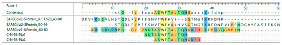 Alignment of cross-reactive peptides C-N-53Na1 and C-N-53Na2 with the N- and S-protein sequences from SARS-CoV2 and the omicron variant. (Coloring as Figure 1).