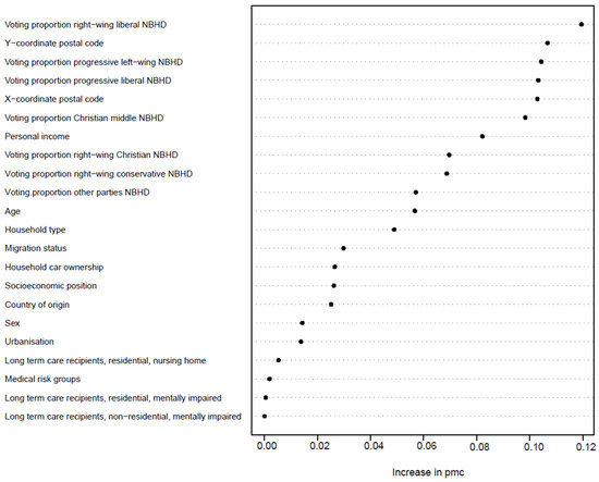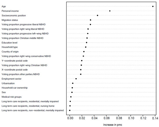 After age, personal income, socioeconomic position, and origin ranked as the second-to-fourth-most important determinants of vaccine uptake. This is consistent with national registry-based studies from Norway, Sweden, and the United Kingdom, which found lower socioeconomic status and migration to be significantly associated with lower COVID-19 vaccine uptake [16,17,18,19]. Possible explanations for this are misinformation about the risks of disease due to COVID-19 and the effects of vaccination, as well as a lack of trust in authorities and the healthcare system. It is further hypothesised that factors such as language barriers, social and cultural beliefs, and religion are important [20,21]. The HELIUS study indicated that the belief that COVID-19 was exaggerated in the media was significantly associated with low vaccination intent in ethnic minority populations in Amsterdam [22]. This highlights the need for tailored communication and outreach strategies and trust [21]. Especially since it was shown that ethnic minority populations were at higher risk of SARS-CoV-2 infection and severe disease [23], further research to investigate reasons for lower vaccine uptake in those groups is important.