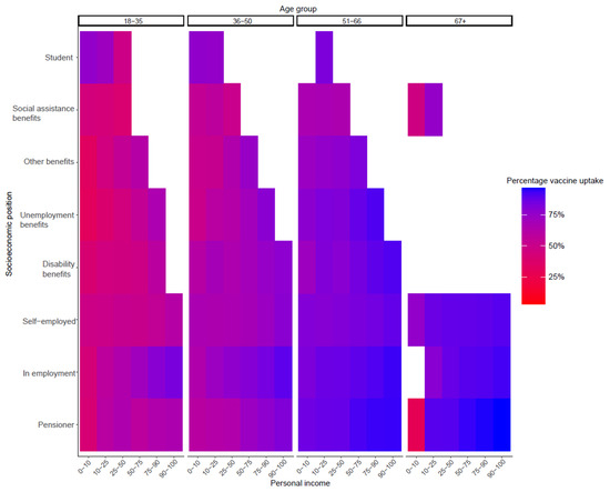 Vaccine uptake by personal income (deciles) and socioeconomic position per age group. Groups with frequencies < 100 were excluded and coloured white.