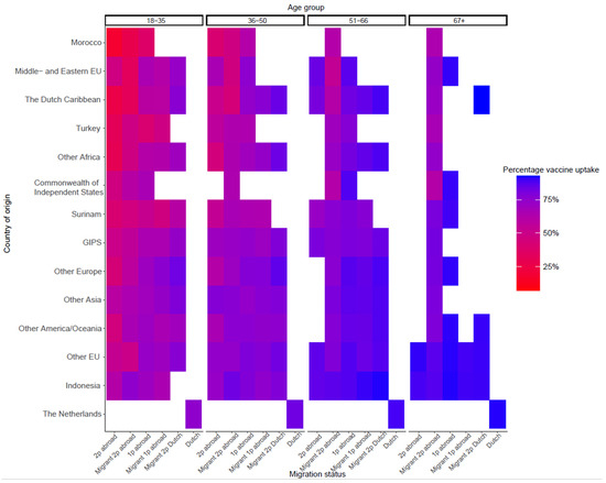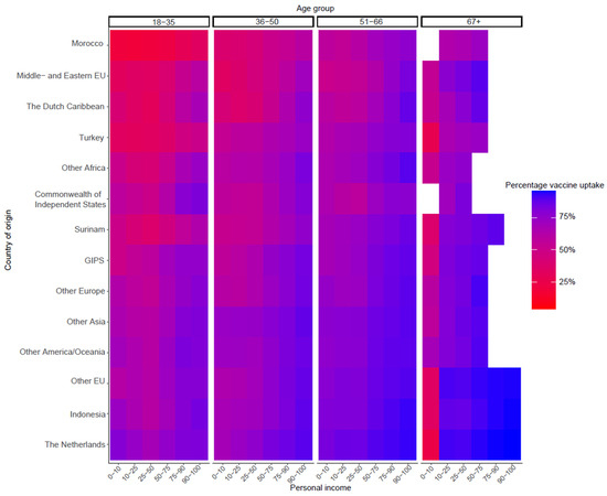 Figure 4 shows the vaccine uptake by country of origin and personal income, per age group. Uptake was higher in higher income groups for all countries of origin. However, for some countries, this is less clear. Particularly in the 18–35 age group, there were only small differences in uptake between the personal income groups in Morocco, Turkey, the Middle and Eastern EU, and Suriname as country of origin.