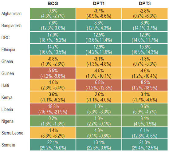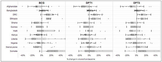 Percent change in immunization service volumes from expected levels based on pre-pandemic trends in 12 countries for BCG, DPT1, and DPT3, by subnational units, from March 2020 to October 2022.