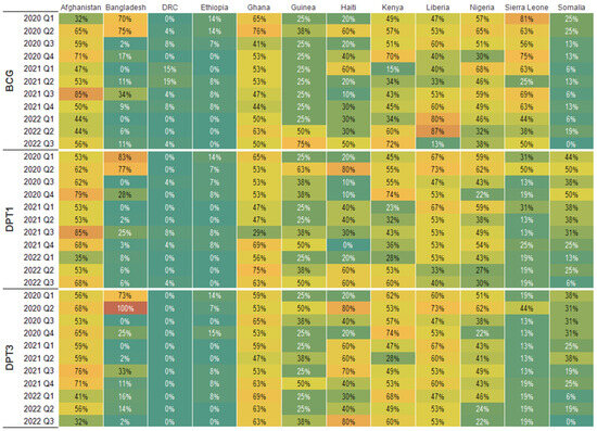 Afghanistan had the highest percentage of subnational units reporting a shortfall of 5% or higher in DPT1 service volume (85% in 2021 Q1 and 79% in 2020 Q4), followed by Bangladesh (2020 Q1, 83%), Haiti (80% in 2020 Q2), and Ghana (2022 Q2, 75%). All subnational units in Bangladesh experienced a 5% or higher shortfall in DPT3 service volume in the second quarter of 2020. In Haiti, 80% of the subnational units experienced a 5% or higher reduction in DPT3 service volume in the second quarter of 2020 and the third quarter of 2022.