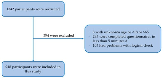 Flow chart of participants selection. Note: #—after testing, we assessed that participants should have completed the questionnaire in at least 5 min.