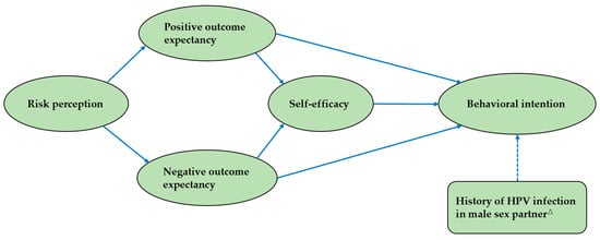 The initial structural equation model of HAPA. Note: the solid line indicates the theoretical model. The dotted line indicates the added path for this study. △ indicates whether a male partner has been infected with HPV in the last six months.