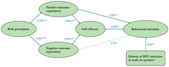 Structural model analysis showed (Figure 3) that self-efficacy and positive outcome expectancy had a greater effect on risk compensation intention, followed by negative outcome expectancy and risk perception. Positive outcome expectancy (β = 0.256, p < 0.001), self-efficacy (β = −0.378, p = 0.020), and history of HPV infection in male sex partner (β = 0.101, p = 0.038) had direct effects on behavioral intention, whereas negative outcome expectancy (β = −0.296, p < 0.05) and risk perception (β = −0.232, p < 0.05) had indirect effects on it. What is inconsistent with the hypothesized model is that negative outcome expectancy had no direct effect on behavioral intention (p = 0.242). Positive outcome expectancy was positively correlated with behavioral intention, whereas self-efficacy, risk perception, and negative outcome expectancy were negatively correlated with it.