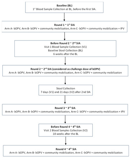 Trained phlebotomists collected three milliliters (3 mL) of whole blood from each child at the three time points, i.e., before the first, second, and third rounds of immunization day supplementary immunization activities (SIAs) (Figure 1). The blood samples for the seroprevalence of polio antibodies were collected at baseline (before the first SIA), six weeks after the baseline (before the second SIA), and 18 weeks after the baseline (before the fourth SIA). Seroconversion (boosting) was assessed six weeks after the baseline (before the second SIA) and 18 weeks after the baseline (before the fourth SIA).