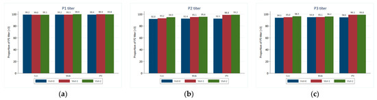Seroprevalence was defined as the proportion of subjects with titers ≥ 3 [1/dil] and calculated for each poliovirus serotype (i.e., P1, P2, and P3). Boosting was determined by a ≥4-fold increase in titers. For this research study, “immune response” encompasses boosting and seroconversion. The immune response analysis was limited to infants with an initial serological titer of ≤362 to guarantee that a 4-fold boosting response could be attainable, given that the highest titer tested was 1:1448 [26]. Intestinal immunity was represented by the composite shedding index of fecal viral titers before and 7 and 21 days after receiving a challenge dose of bOPV.