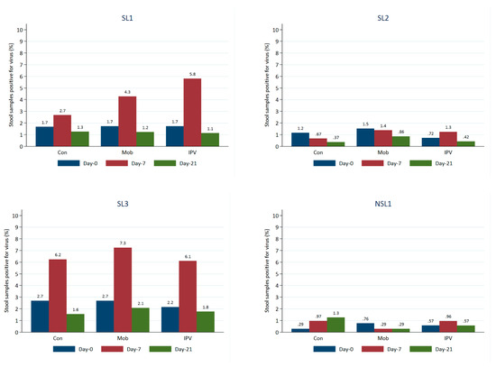 The most frequently detected viruses in the stool samples at baseline were the Sabin-like virus (SL3, SL2, and SL1). The findings revealed that approximately 2–3% of stool samples were positive for SL3 and SL1 and that 1–2% were positive for SL2.