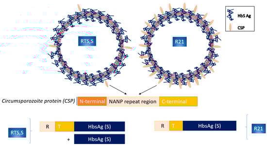 The circumsporozoite protein (CSP) on the surface of the malaria sporozoite is represented early in the liver phase of infection, and it is considered a major antigen component []. The RTS,S/AS01Ε (RTS,S), the most advanced of the subunit malaria vaccines, is a pre-erythrocytic P. falciparum vaccine that consists of a protein (RTS) of the NANP repeat and C-terminal portions (R and T, respectively) of the NF54 strain of P. falciparum CSP, fused with the hepatitis B virus surface antigen (HBsAg; the S portion). It is administered with a liposome-based adjuvant (AS01), which is used to enhance the immune response to vaccination through antibodies and CD4+ T cells [,] (Table 1, Figure 1). The antibodies after vaccination have to act quickly in order to prevent sporozoites’ invasion of hepatocytes (naturally, sporozoites reach the liver within 30 min after a mosquito bite) and also to elicit a cellular response, enabling the destruction of infected hepatocytes [,]. Phase 3 trials showed a median vaccine efficacy against malaria of 55.1% (95% confidence interval [CI], 50.5–59.3%) over 12 months after vaccination when delivered according to a 0-, 1-, and 2-month schedule in children aged 5–17 months at first vaccination []. Despite the limited efficacy and the fact that it wanes over multiple years, RTS,S /AS01E is the first malaria vaccine (trade name Mosquirix, GlaxoSmithKline Biologicals SA) that gained WHO approval in October 2021 [] (Table 1). It has been approved for vaccination in children under the age of two residing in regions of moderate to high malaria transmission. Moreover, it is recommended to be provided in countries with seasonal malaria transmission. Implementation of Mosquirix vaccination has reduced hospital admissions for severe malaria by around 30% (modest efficacy) []. Moreover, a booster vaccination schedule, including a delayed and fractional third dose showed 87% efficacy in malaria-naïve adults but not in children []. The modest efficacy of RTS,S/AS01E predicates the development of an optimal vaccine against malaria a clinical need.