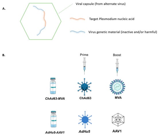 Schematic representation of viral-vector vaccine components. (A) Schematic representation of general viral-vector vaccine components. In a viral capsule usually from alternate virus (green), a recombinant DNA is incorporated which contains part of a virus genetic material (inactive and/or harmful) (blue) and the target Plasmodium gene. (B) Schematic representation of two prominent viral-vector-vaccine approaches against malaria in humans.