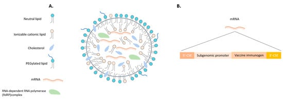 Schematic representation of potential self-amplifying mRNA-LNP vaccine components. (A) Schematic representation of an LNP formulation. The membrane consists of neutral lipids, polyethylene glycol lipids (PEGylated lipids), cholesterol and ionizable cationic lipids. For the self-amplifying mRNA-LNP vaccine, in the formulation the target mRNA must be included along with RNA-dependent RNA polymerase (RdRP) complex which will enable the intracellular RNA amplification and the consequently abundant expression of the target protein upon the immunisation of the host. (B) The target self-amplifying RNA encodes 5′ and 3′ CSE (conserved sequence element) sequences, a subgenomic promoter and the vaccine immunogen.