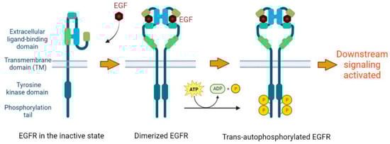 When the extracellular ligand-binding domain of EGFR is not bound to its ligand, this protein exists as a monomer on the plasma membrane (PM) and the tyrosine residues located in the intracellular TK domain and regulatory tail domain are not phosphorylated [4,7,8]. In this inactive state, downstream signaling is not triggered. However, upon binding to its ligand, EGFR undergoes a series of conformational changes, leading to its homodimerization or heterodimerization with other ErbB members [7,9]. This allows the formation of an asymmetric dimer between the two juxtaposed intracellular TK domains in which one kinase domain (called the “activator kinase”) allosterically activates the other (“receiver kinase”) by trans-phosphorylating its critical intracellular tyrosine residues [4,10]. Thereafter, the receiver kinase also activates the activator kinase through an trans-autophosphorylation mechanism. The newly phosphorylated tyrosine residues serve as attachment sites for multiple adaptors (e.g., GRB2), cytoplasmic enzymes (e.g., PLC-gamma) or transcription factors (e.g., STAT3), thereby triggering downstream signaling cascades [5,8] (Figure 1). The major signaling pathways triggered by EGFR activation include the Ras/MAPK pathway, the PI3K/AKT pathway, and the JAK/STAT pathway [7,8]. Those signaling pathways are largely pro-survival and anti-apoptotic, playing crucial roles in cell survival, proliferation, differentiation, and motility [4,11].