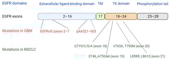 The most frequent EGFR mutations in different cancer types are illustrated in Figure 2. It is clear that different cancer types have unique mutation patterns. Mutations occurring in GBM are frequently enriched in the extracellular ligand-binding region; for example, the EGFRvIII mutation causing the loss of exons 2 to 7, indicating that sustained downstream signaling caused by ligand-independent EGFR activation may be involved in the pathogenesis of GBM. By contrast, in NSCLC the most common mutations are located within the intracellular TK domain (Figure 2) (e.g., the L858R point mutation or exon 19 E746_A750 deletion).